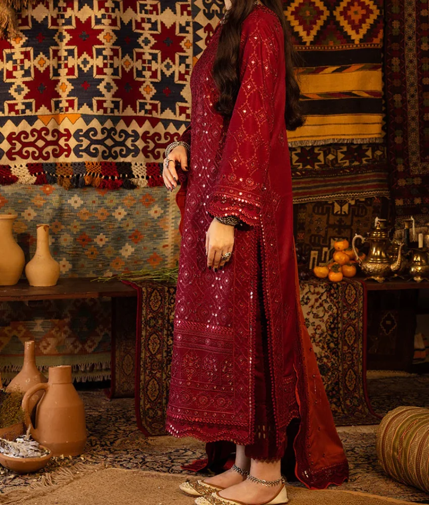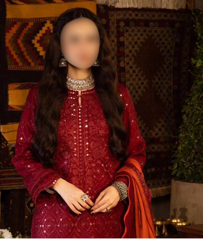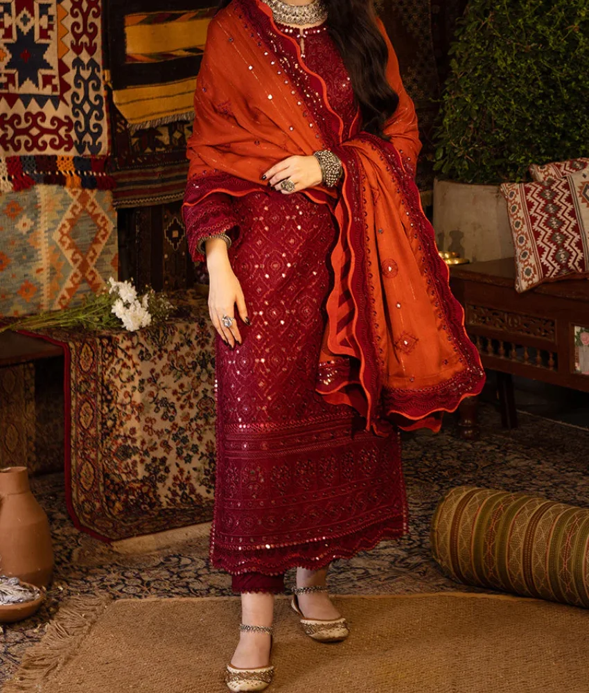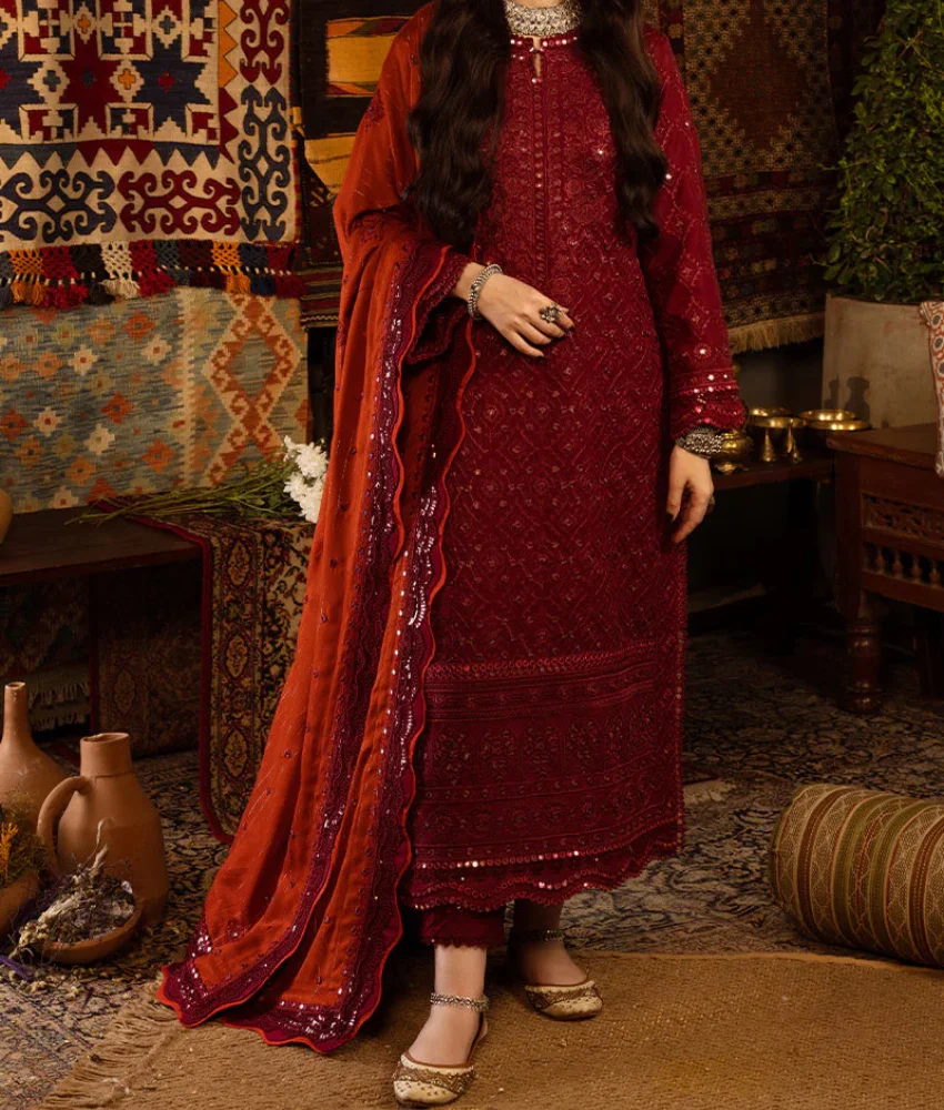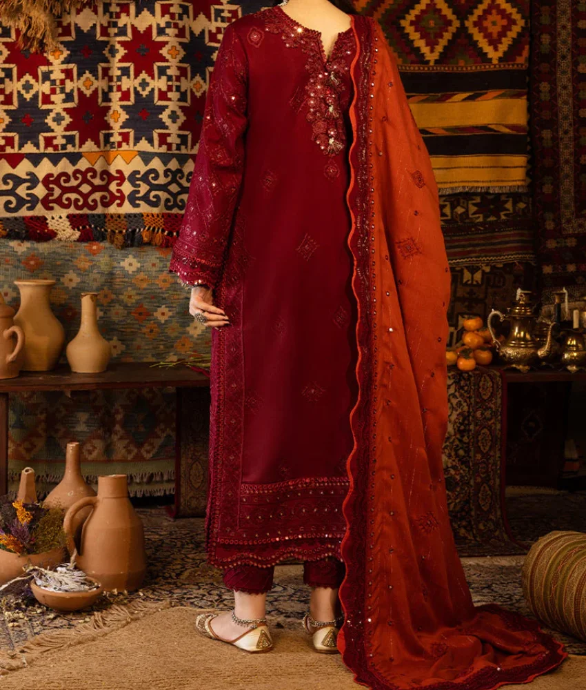 Elevate your style with this stunning Asim Jofa maroon embroidered self-twill suit. The shirt features intricate embroidery on the front, back, and sleeves, complemented by elegant neckline details and finely crafted borders. Paired with an embroidered orange shawl-style dupatta and comfortable dyed twill trousers, this 3-piece outfit delivers a rich, festive look with beautiful designer-quality finishing. A perfect choice for events, gatherings, and standout seasonal style.