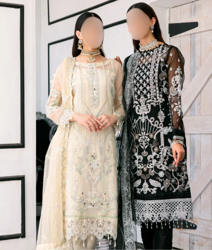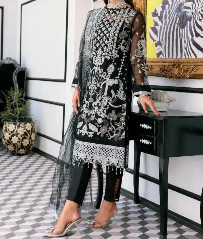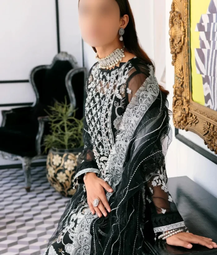 Be the first to review “Handmade Silver Embroidered Neckline Organza Outfit in Black” Cancel reply