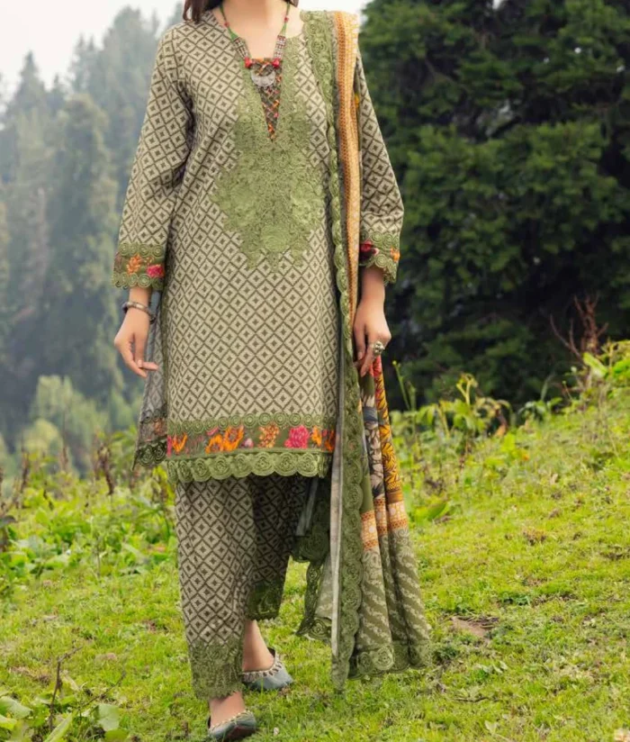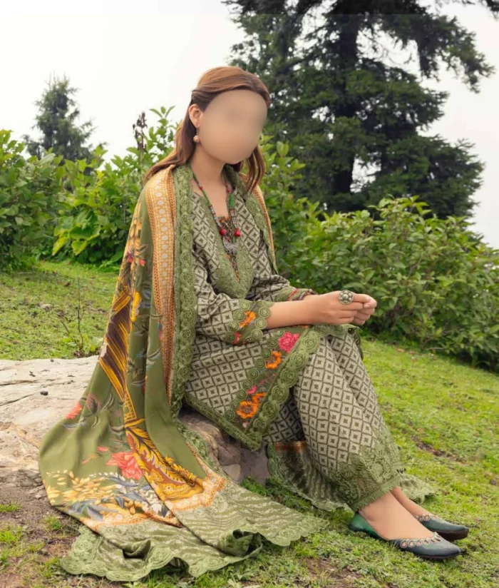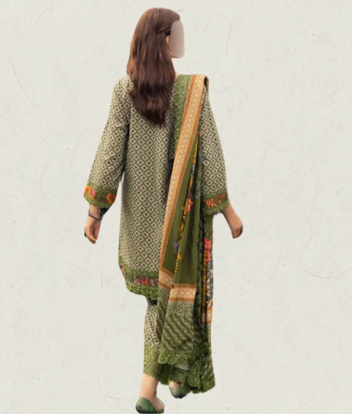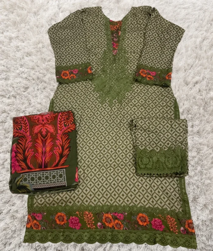 Be the first to review “Stitched Green Geometric Print & Embroidery Staple Linen Suit” Cancel reply