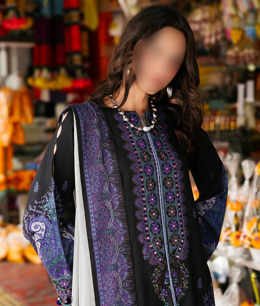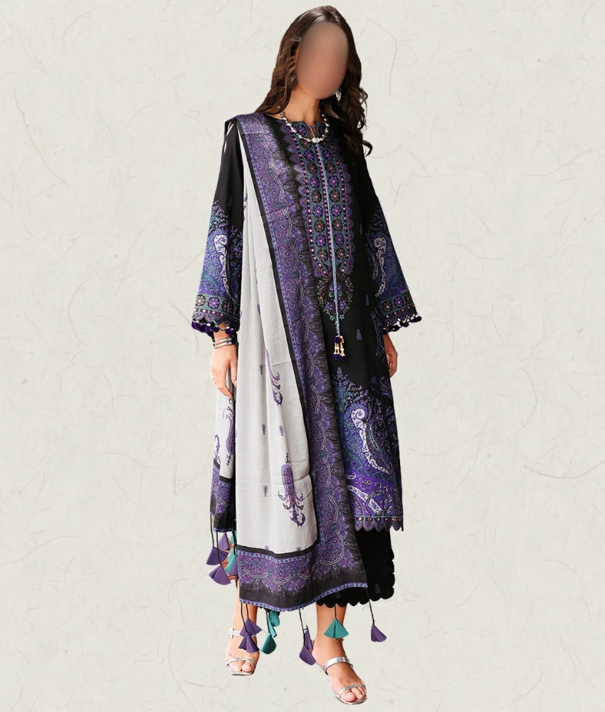 Charizma Unstitched Purple Print & Embroidered Linen 3-Pc Suit