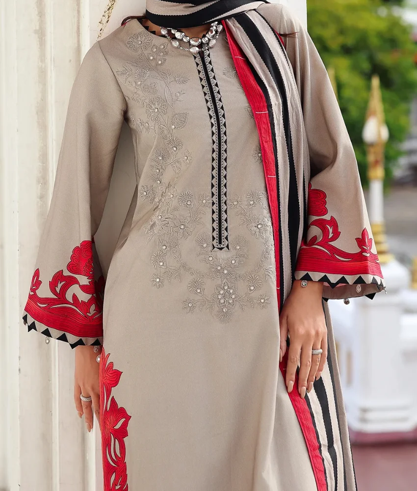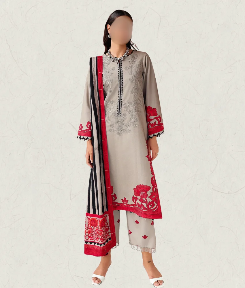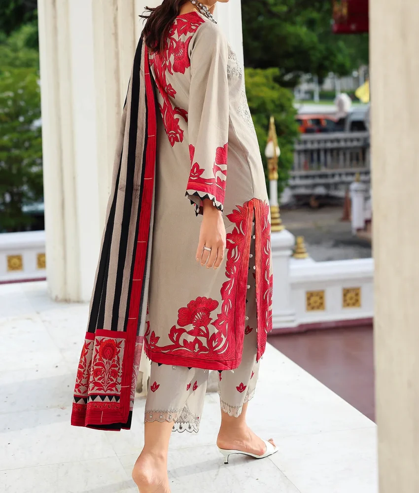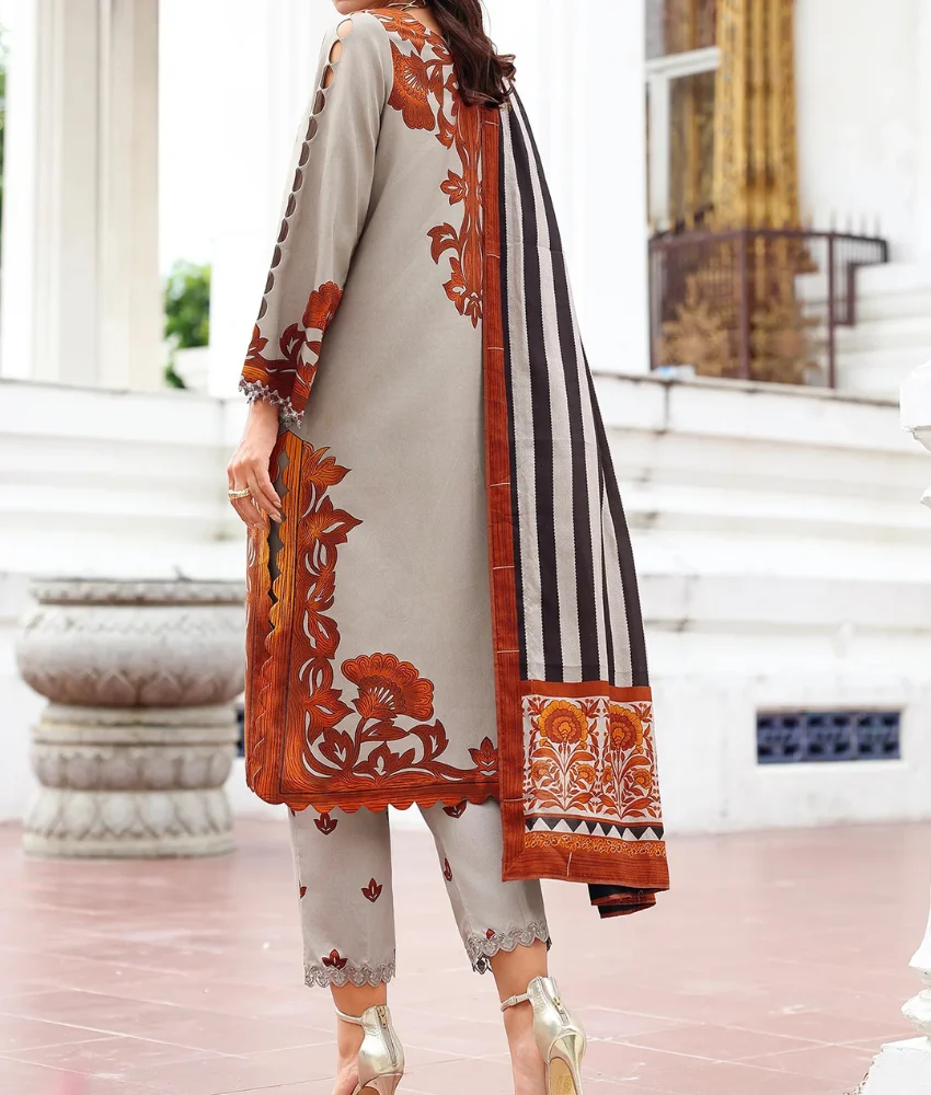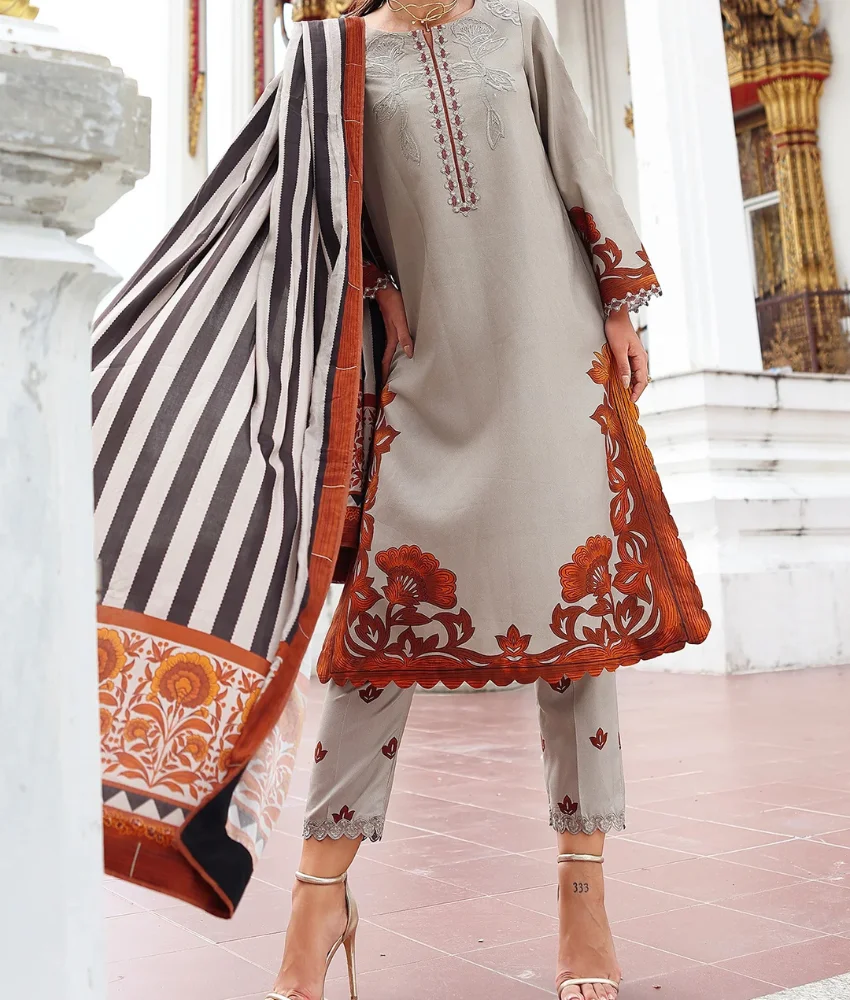 Charizma Grey Floral Printed Linen Suit with Embroidery Details