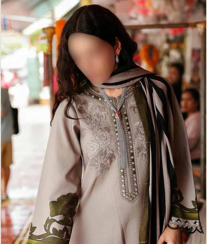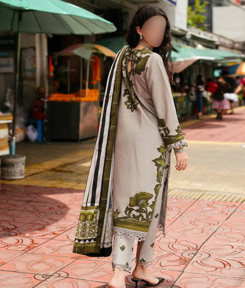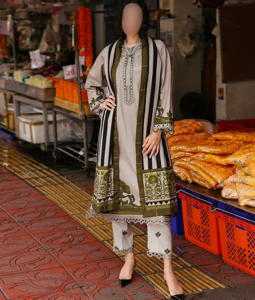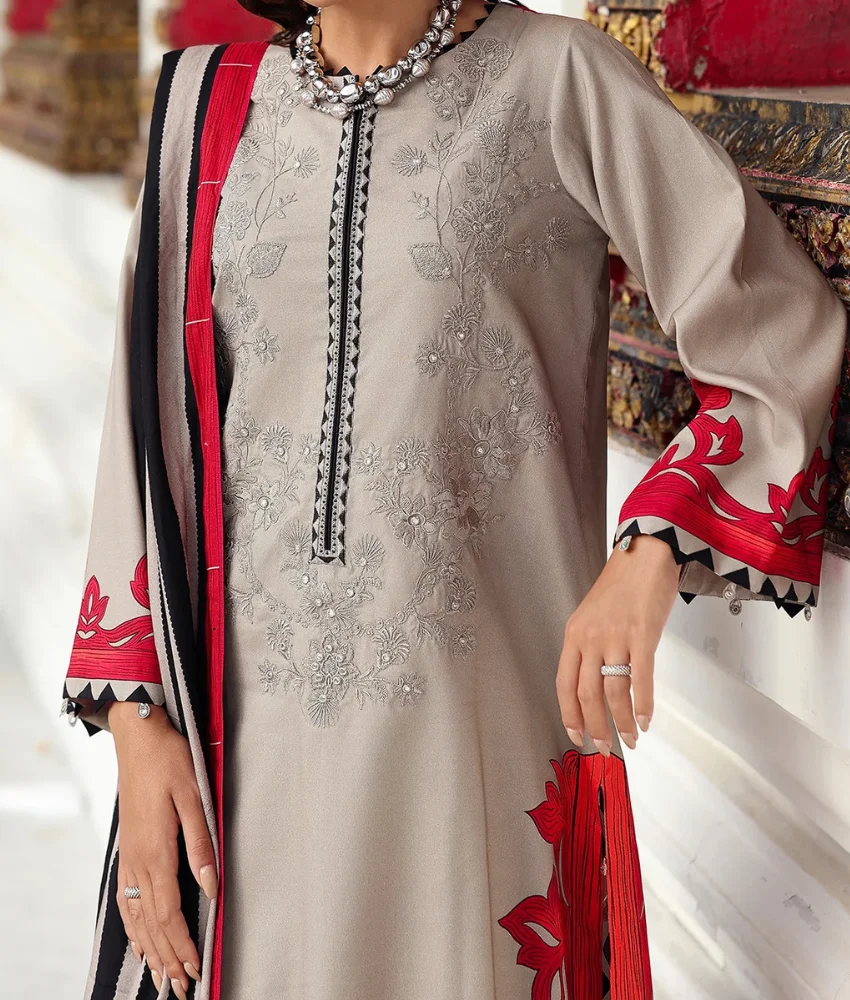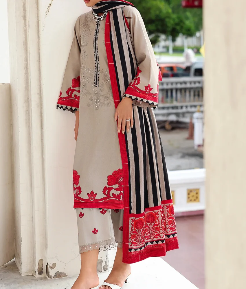 Charizma Grey Floral Printed Linen Suit with Embroidery Details