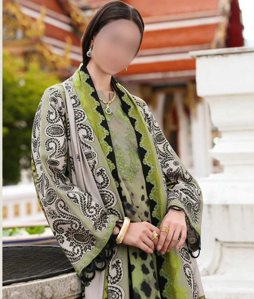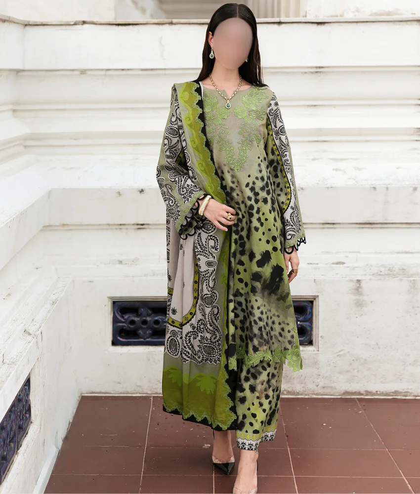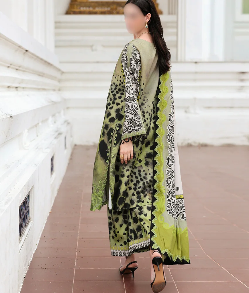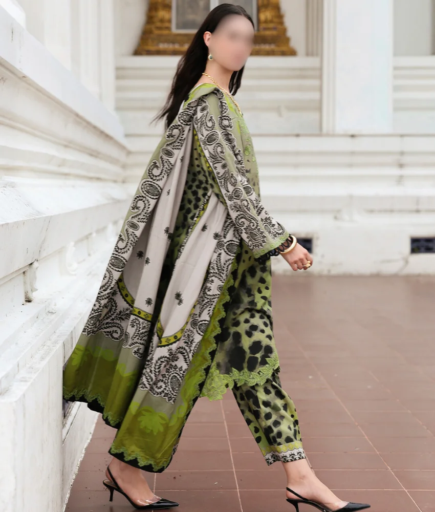 Digital Leopard Printed Linen Suit in Green with Leaf Embroidery