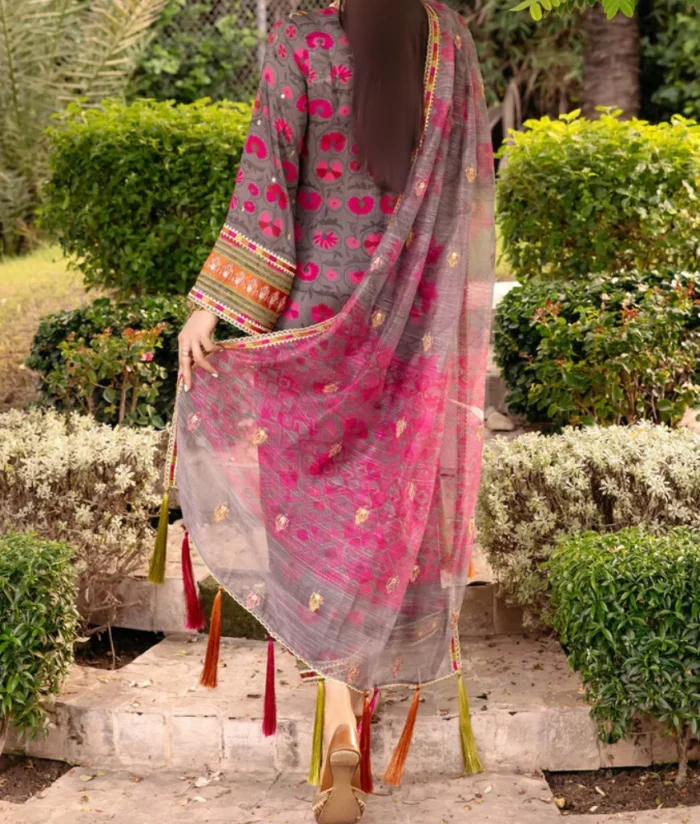 3Pc Prink Floral Print & Gold Embroidered Viscose Suit in Grey