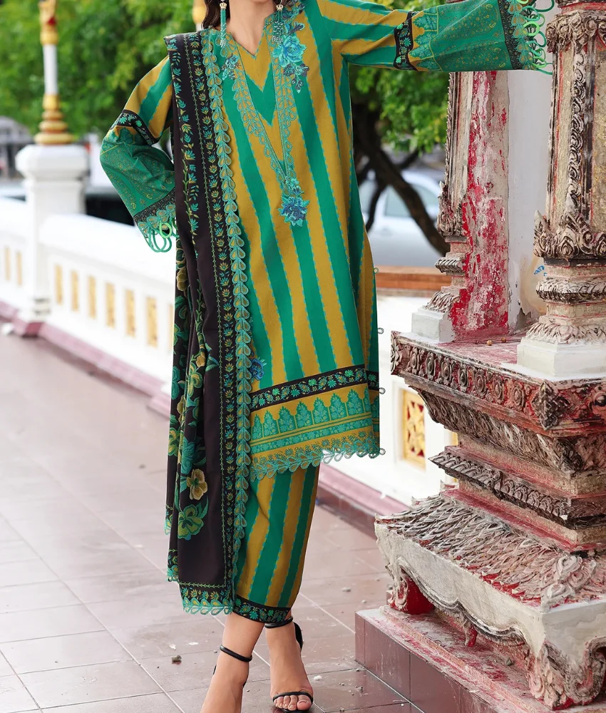 Refresh your seasonal wardrobe with this Charizma green and mustard stripe printed linen unstitched suit, designed for women who love elegant prints with traditional detailing. The shirt features bold vertical stripe prints beautifully enhanced with delicate embroidery on the neckline and borders, giving the outfit a refined ethnic look.