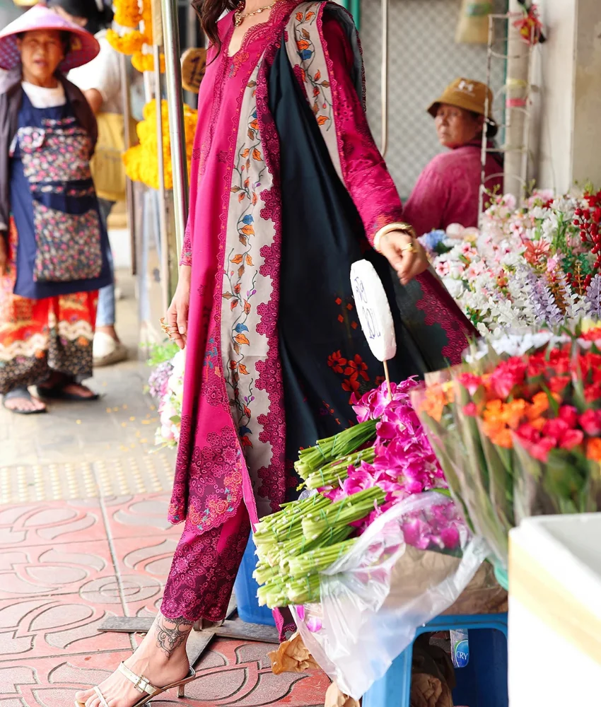 Make a bold style statement with this Charizma magenta floral printed linen unstitched suit, designed for women who love rich colours with elegant detailing. The shirt features an all-over floral print enhanced by subtle embroidery on the neckline and borders, adding a refined ethnic charm.