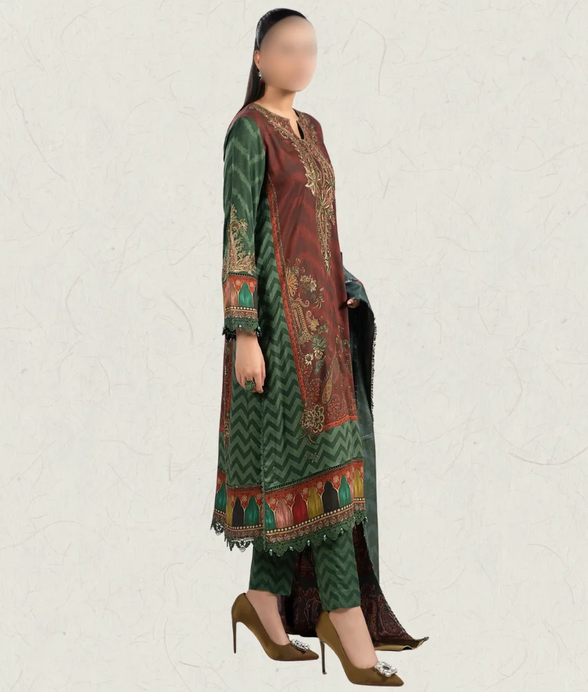 A stylish zigzag-floral printed soft linen suit featuring elegant embroidery patches, a premium herringbone shawl, and matching printed soft linen trousers — a modern, coordinated look perfect for everyday and occasion wear.