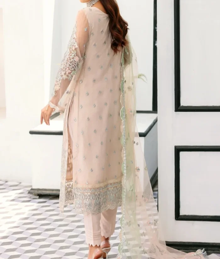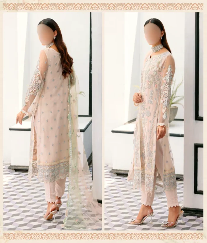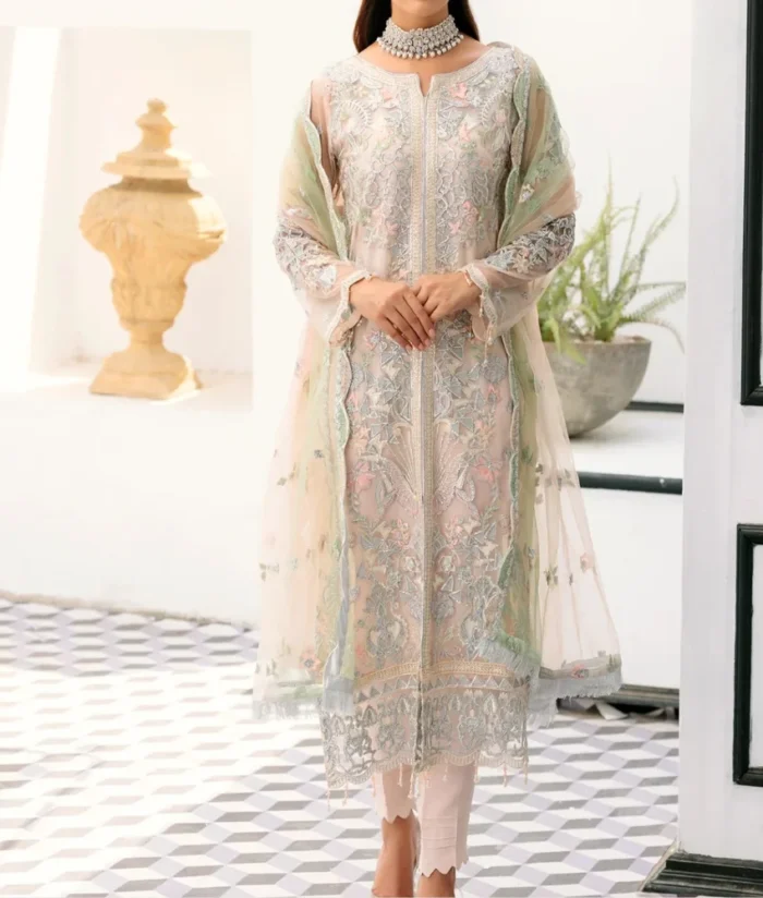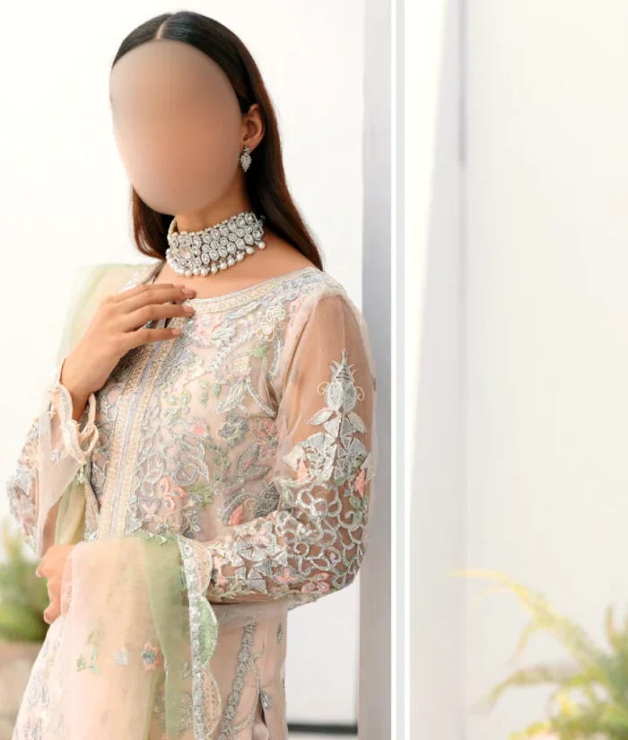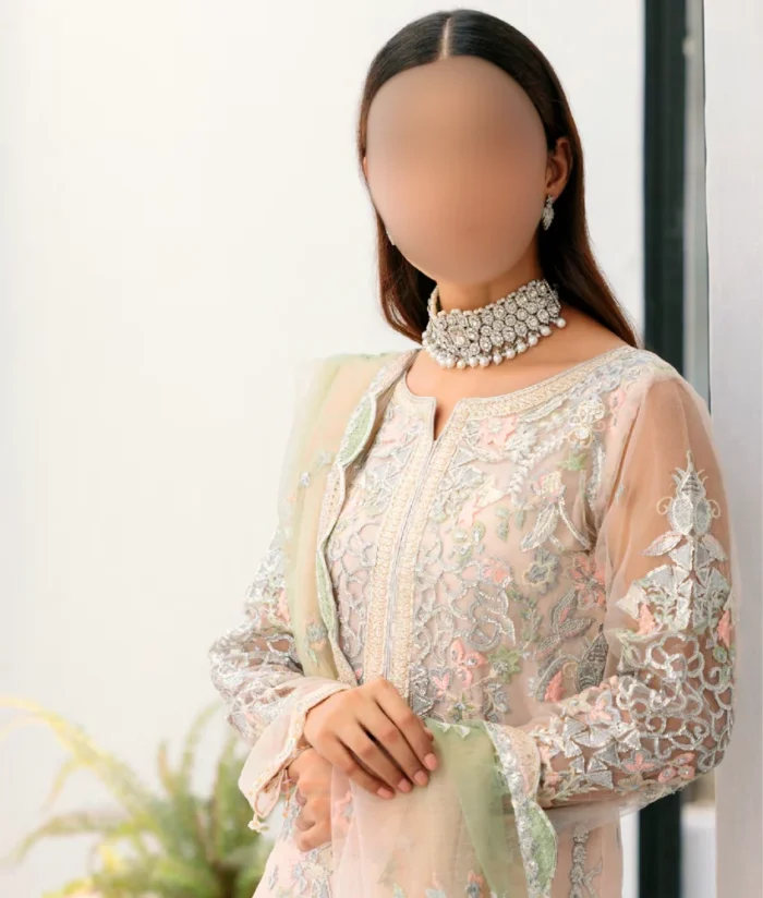 Be the first to review “Pink Net Wedding Dress with Silver Embroidery & Flowy Dupatta” Cancel reply