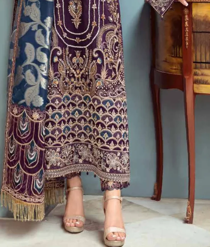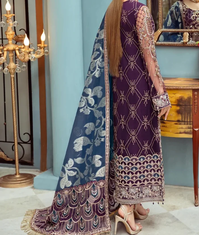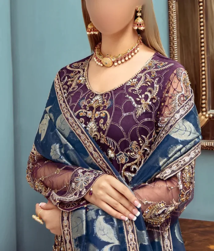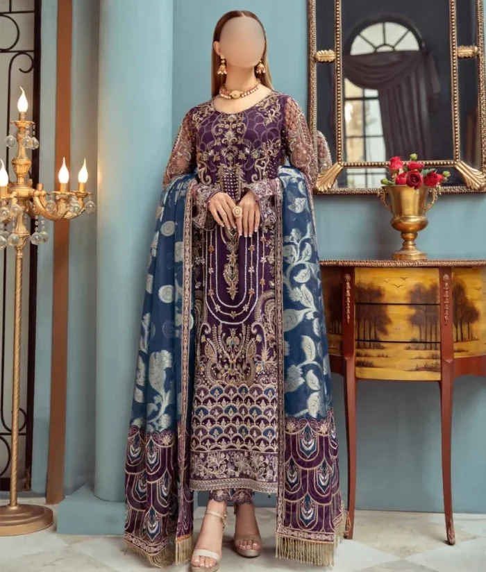 Luxury Hand-Made Pearls Embroidered Net Dress In Purple