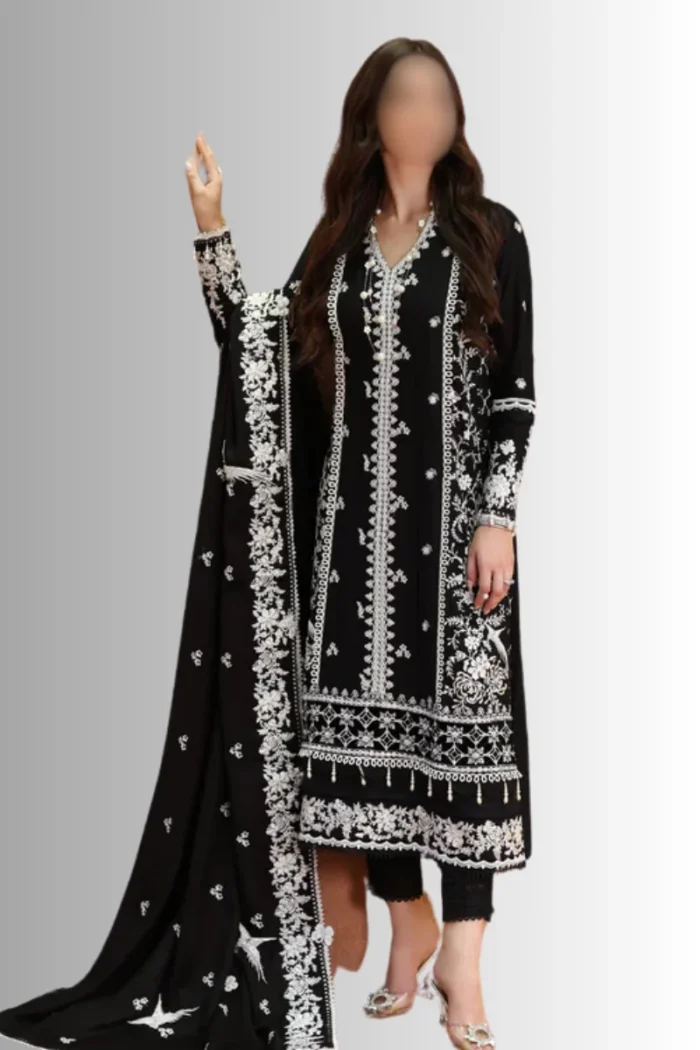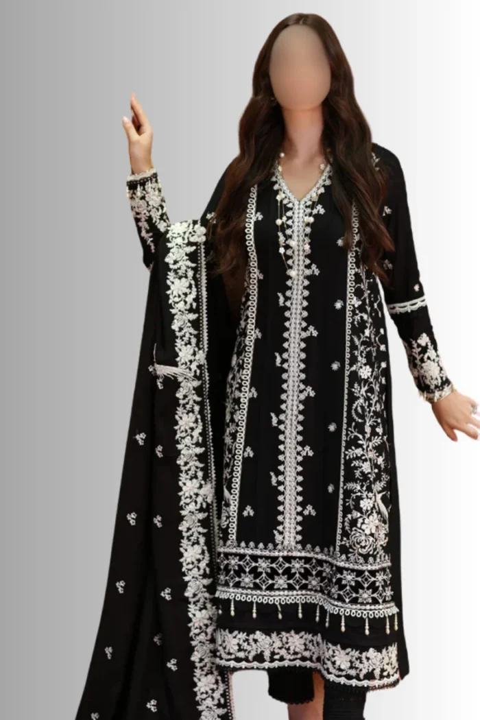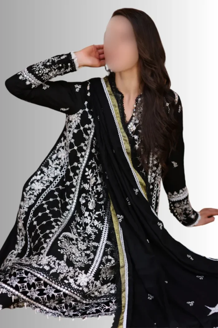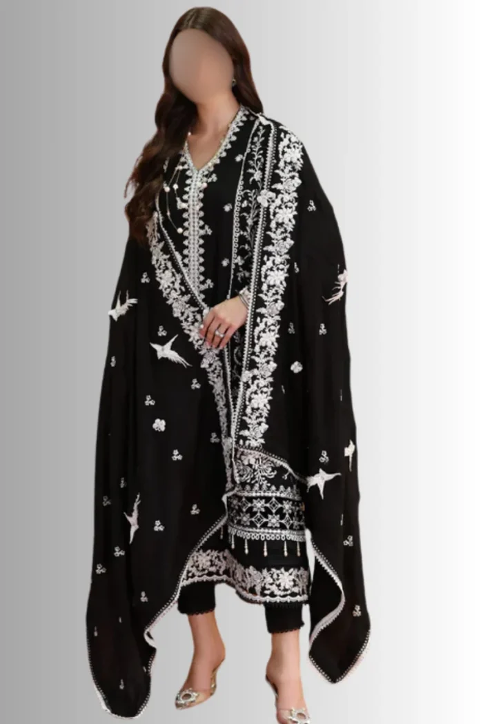 Color: The outfit is primarily black, with intricate white embroidery that adds an elegant contrast.