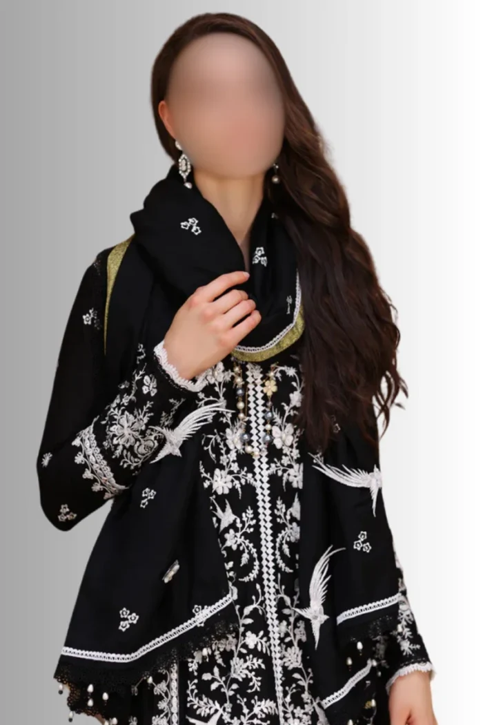Shawl Fabric: The shawl is made from luxurious pashmina, known for its soft texture and warmth, making it a perfect complement to the outfit.