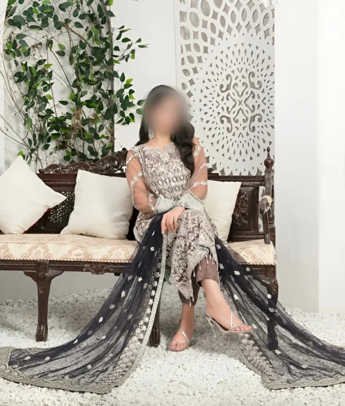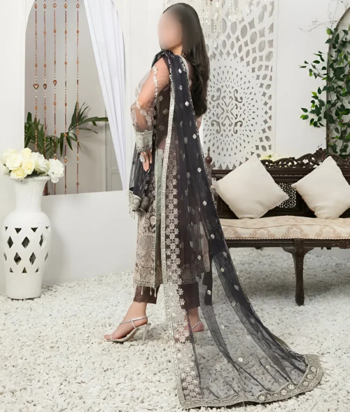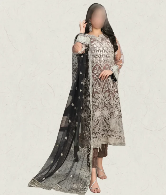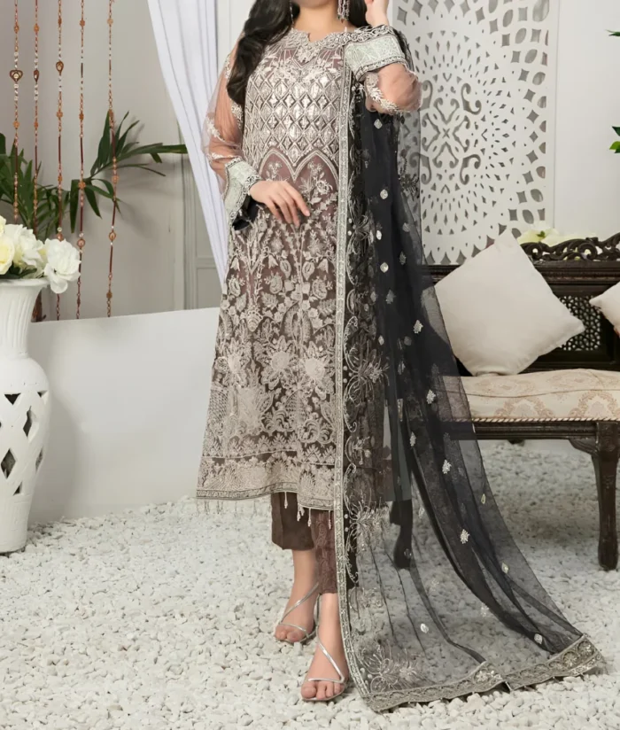 Be the first to review “Luxuries Semi-Stitched Floral Embroidered Net Dress in Coffee Brown” Cancel reply